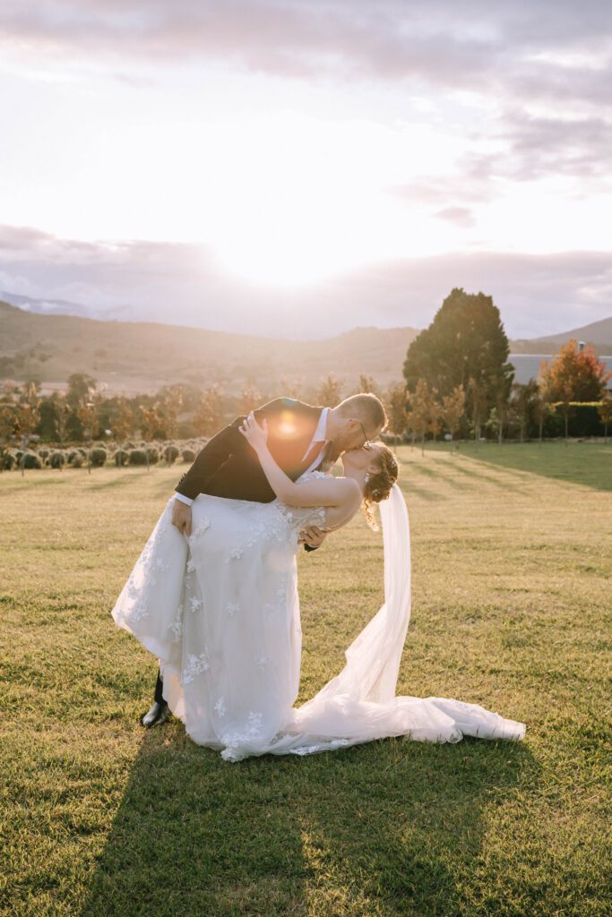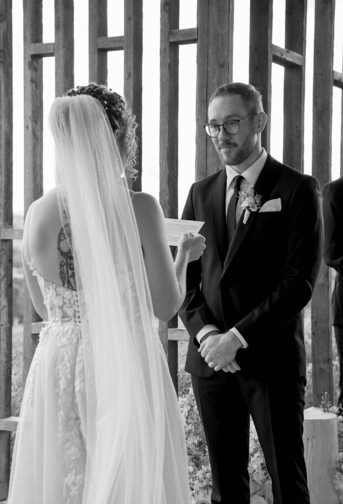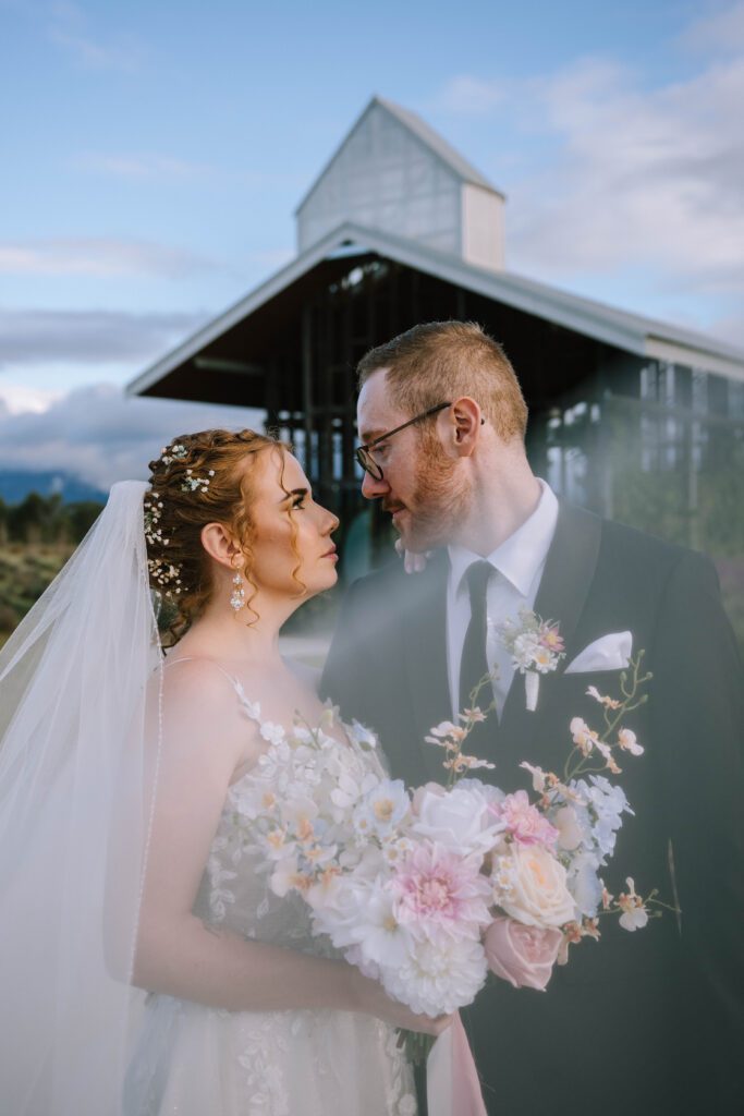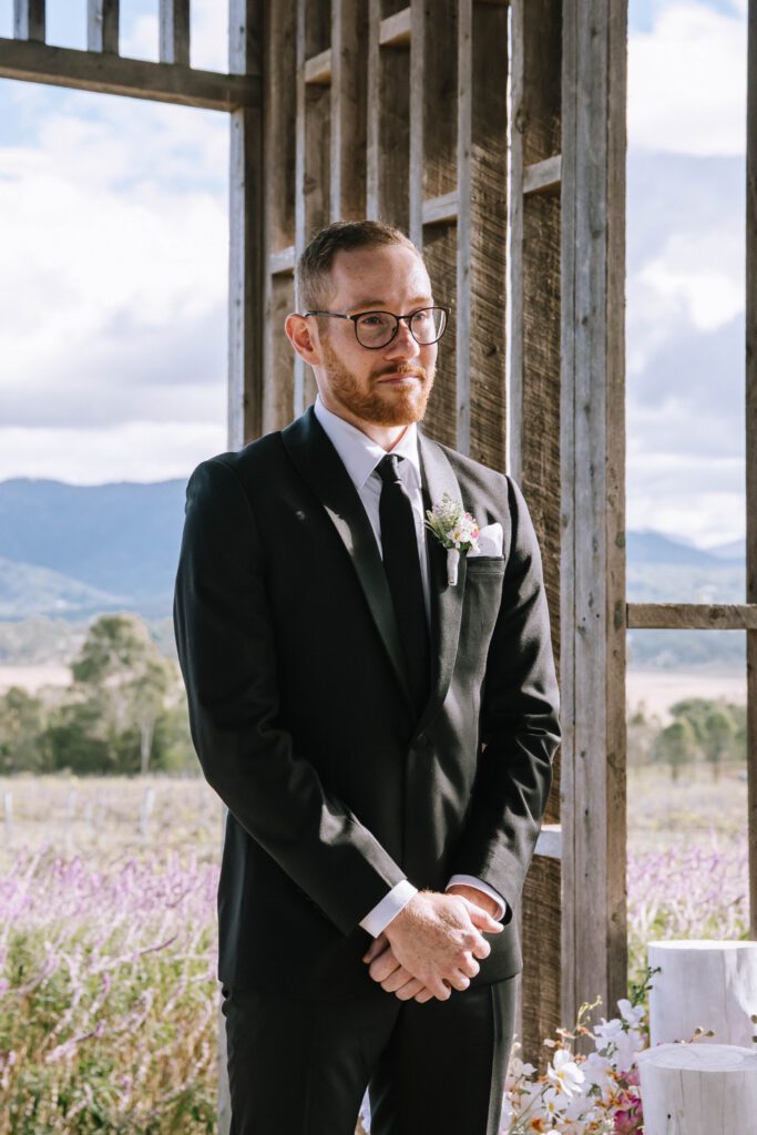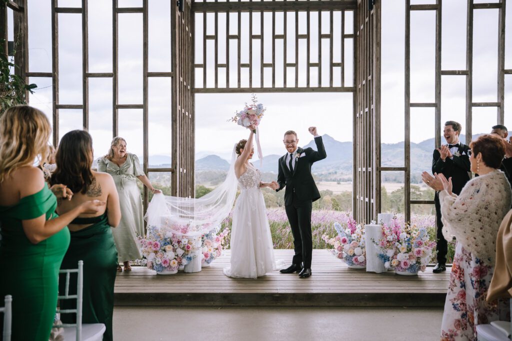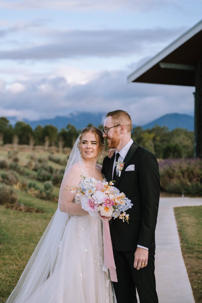 Their ceremony took place in Kooroomba’s stunning open-air chapel, overlooking the lavender fields and the sweeping Scenic Rim mountains beyond. It’s a ceremony space that feels both grand and intimate — open to the landscape, yet intentionally designed for moments that truly matter.